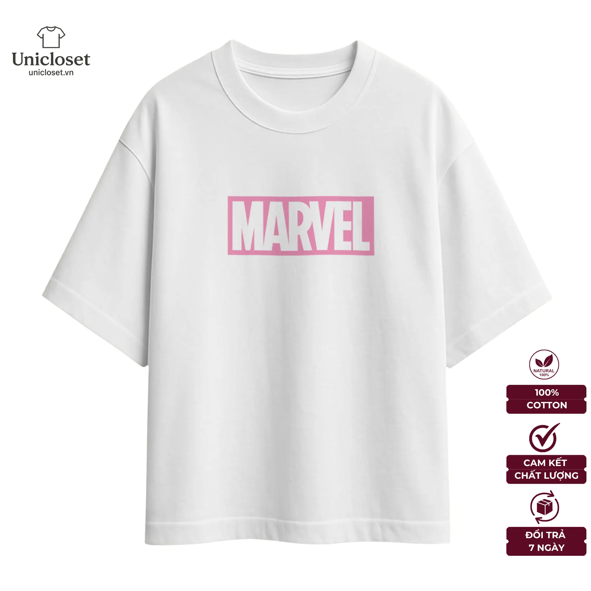 Tone nền hồng trẻ trung kết hợp chữ trắng nổi bật mang lại cảm giác fresh, pop-art nhưng vẫn giữ nguyên chất retro cổ điển từ logo Marvel huyền thoại.