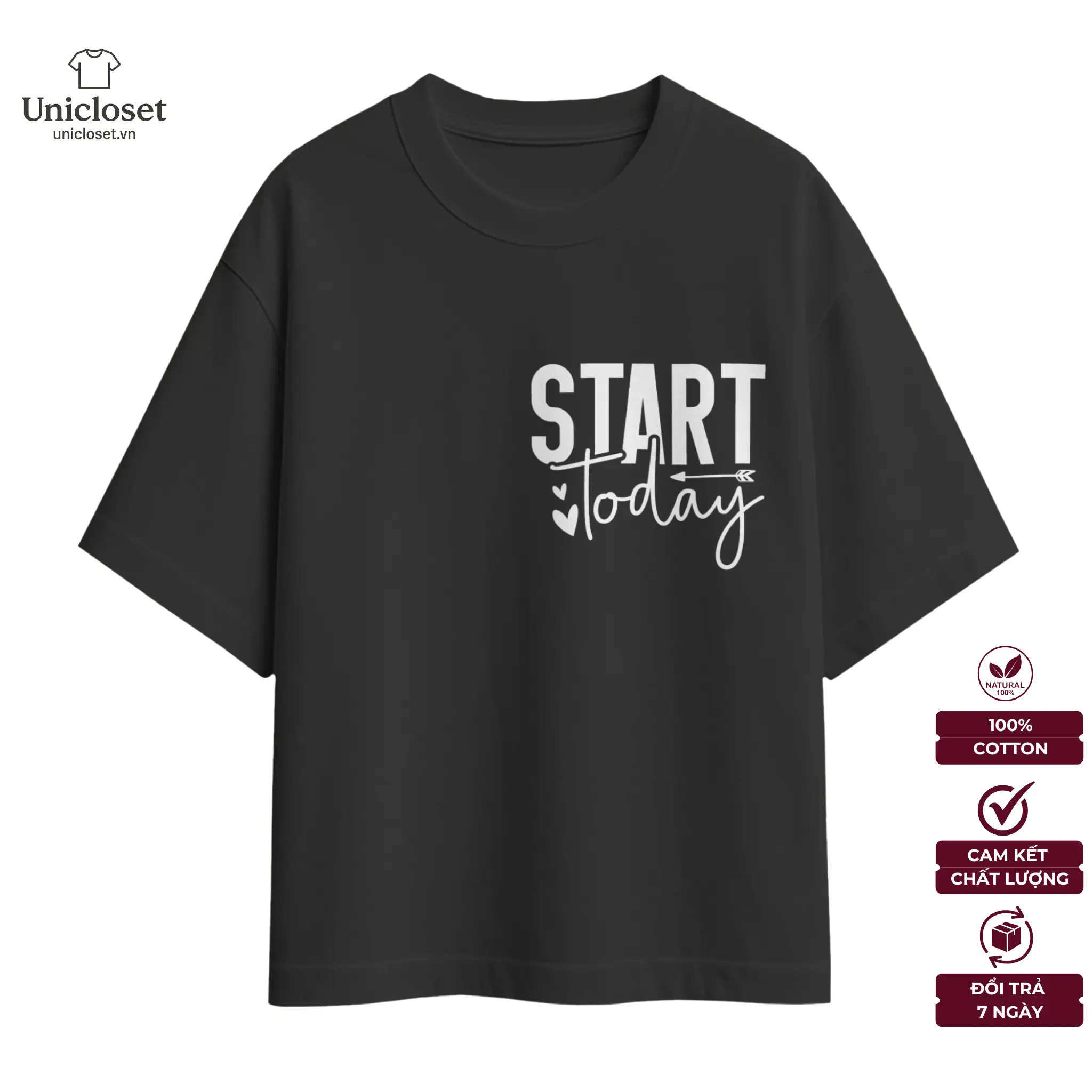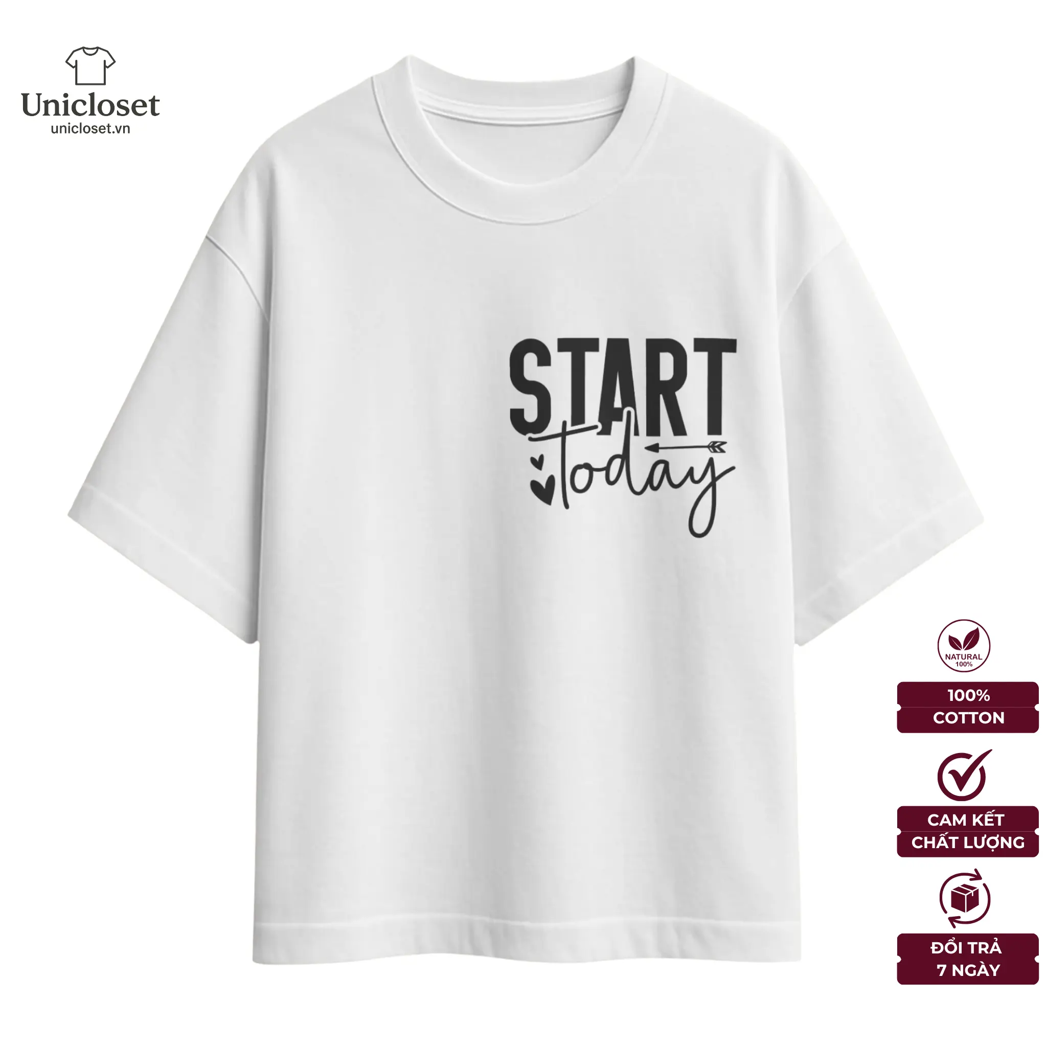 Áo thun truyền cảm hứng với dòng chữ START TODAY là lời nhắc nhở mạnh mẽ: Đừng đợi thời điểm hoàn hảo, hãy bắt đầu ngay hôm nay.